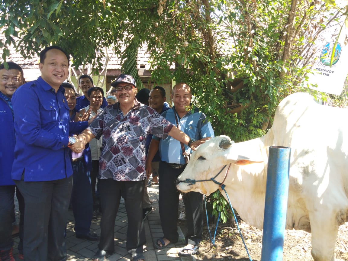 Sebelum penyerahan di kantor PWI Jatim. Ketua Bappilu Ipong Muchlisoni menyerahkan 2 ekor kambing ke SMK Tanwir Surabaya. Serta 1 ekor sapi bagi warga di perkampungan Kedunganyar.