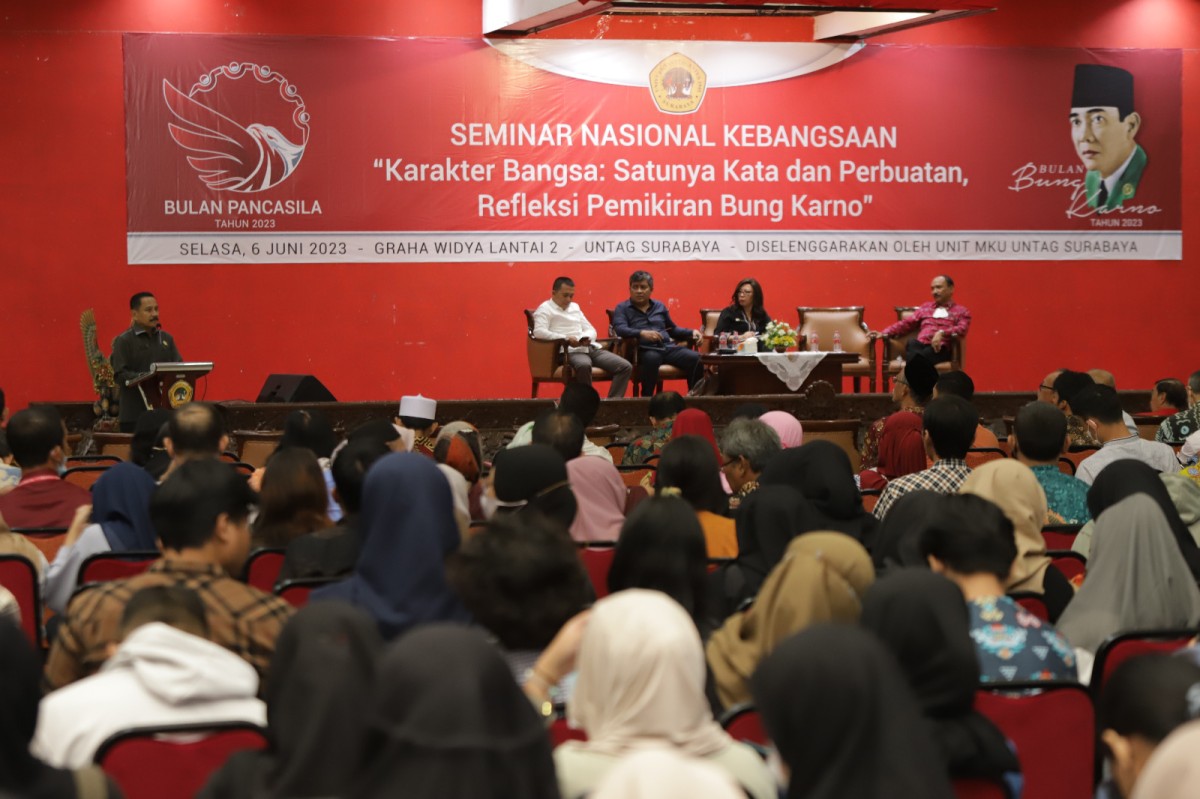 Wiyata Rabu, 07 Jun 2023 10:00 WIBjatimnow.com - Peringati hari lahir Bung Karno, Unit Mata Kuliah Umum (MKU) Universitas 17 Agustus 1945 (Untag) Surabaya menggelar Seminar Nasional Kebangsaan, 'Karakter Bangsa: Satunya Kata dan Perbuatan, Refleksi Pemikiran Bung Karno’.