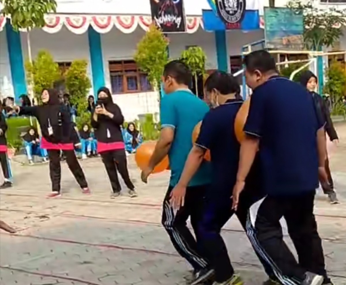 Bahan yang harus disiapkan balon berisi air, jaring net, sarung. Masing-masing pemain memegang ujung sarung dan selanjutnya melempar balon air dengan sarung.