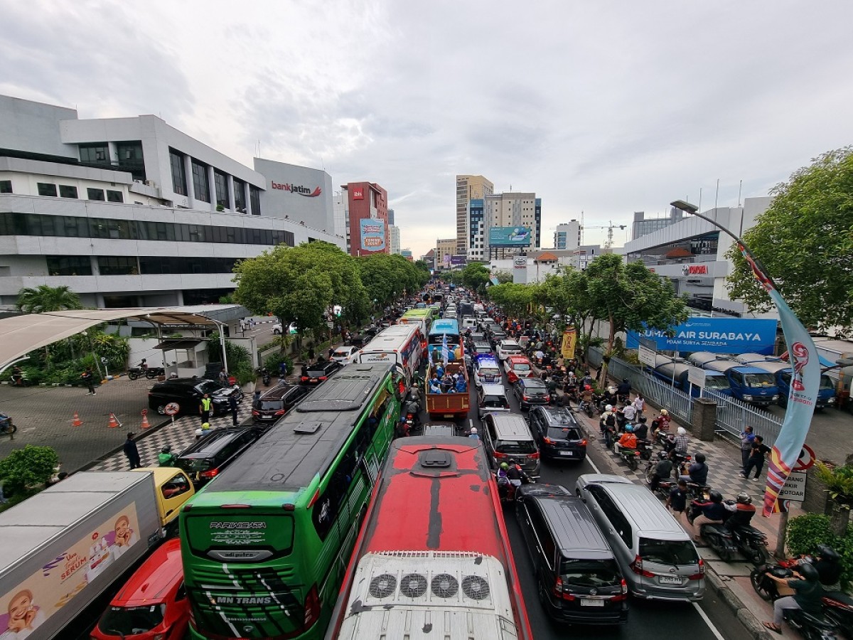 Pantauan jatimnow.com di lokasi, akses menuju ke pusat Kota Surabaya lumpuh total. Mulai dari Bundaran Waru, Jalan Darmo, hingga Jalan Basuki Rahmat.