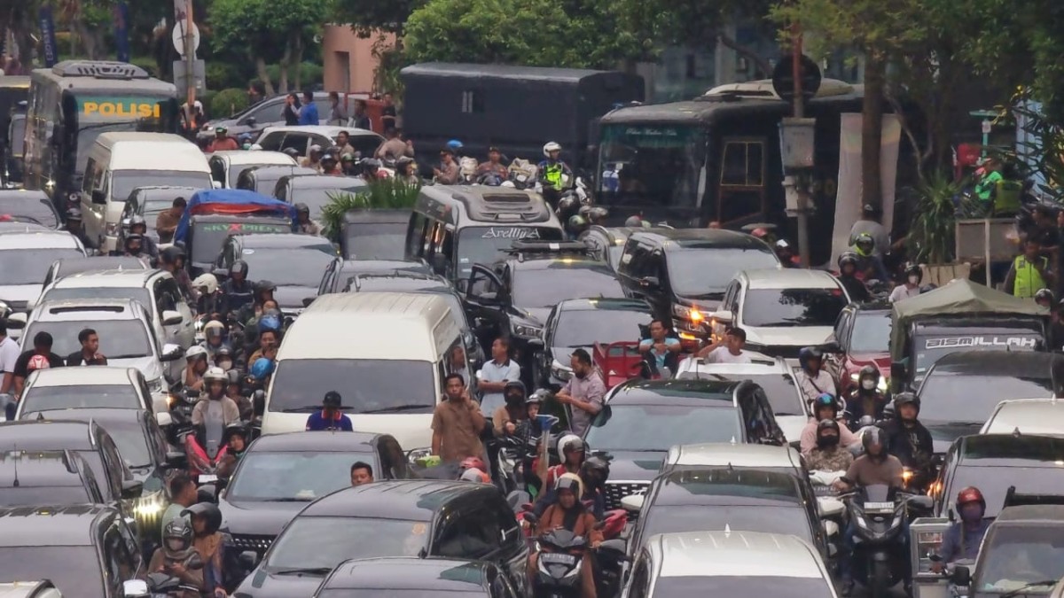 Pengguna jalan roda empat banyak yang memilih mematikan mesin. Sedangkan kendaraan roda dua banyak lewat trotoar hingga memarkir kendaraannya di bibir jalan.