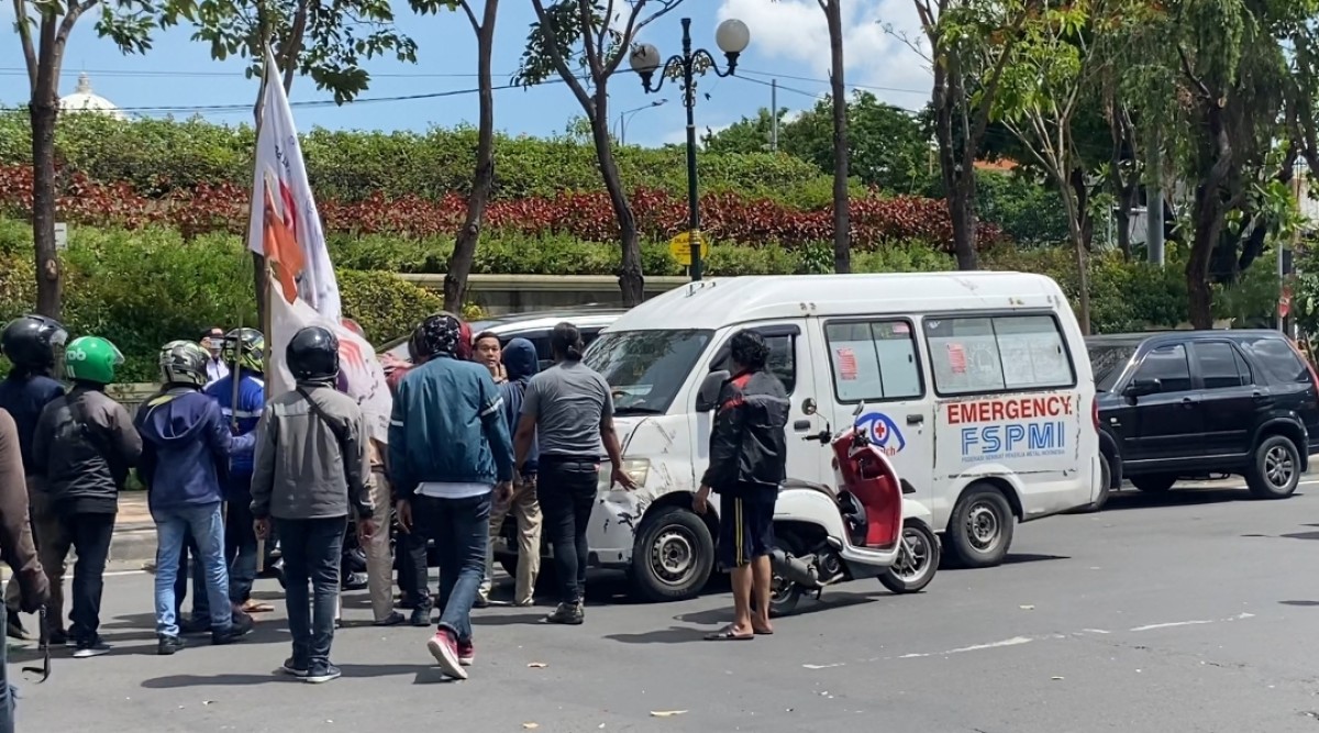 Pantauan, salah satu mobil ambulance milik massa aksi menutup salah satu ruas jalan. Melihat itu, Kasat Lantas Polrestabes Surabaya AKBP Arif Fazzlurahman meminta supaya ambulance itu masuk ke jalur massa aksi supaya kendaraan lain bisa lewat.