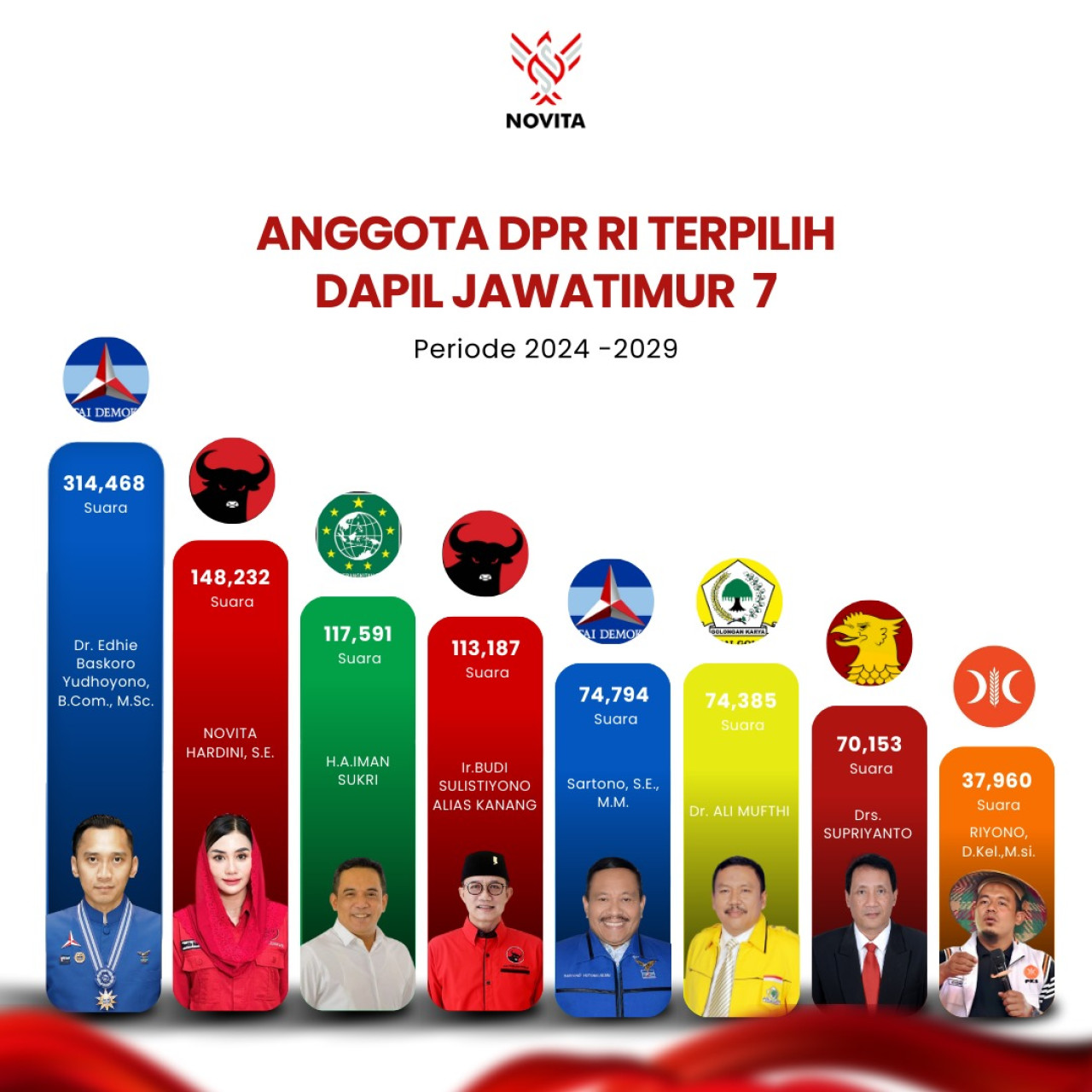 Sesuai data Real Count KPU, Dapil 7 Jatim PDI Perjuangan berada di urutan kedua sekaligus mengamankan 2 kursi DPR RI untuk Novita Hardini dan Budi Sulistyono. Novita juga merupakan perempuan satu-satunya yang lolos di Dapil ini.