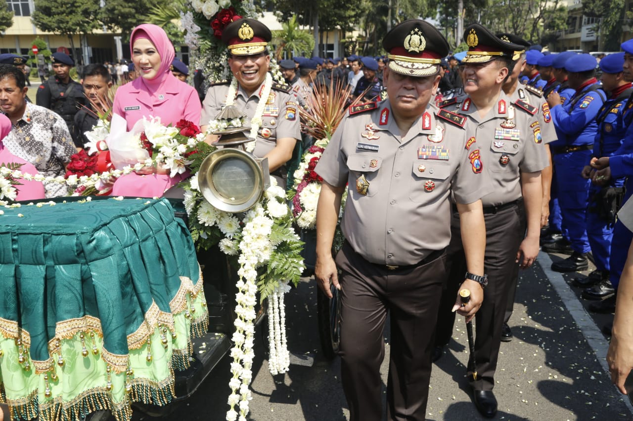 Bahkan, kapolda dan wakapolda ikut menarik kereta kencana yang ditumpangi Machfud Arifin beserta istri.