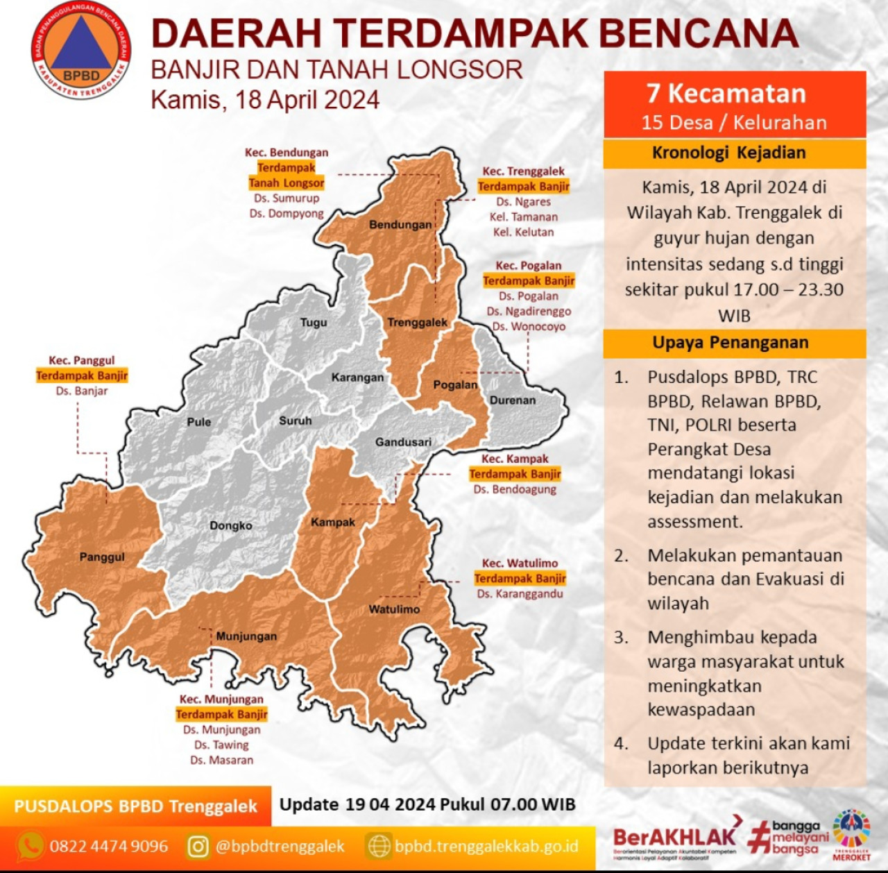 Peristiwa Jumat, 19 Apr 2024 08:33 WIBjatimnow.com - Intensitas hujan tinggi yang terjadi kemarin sore menyebabkan bencana banjir dan tanah longsor di 7 wilayah Kabupaten Trenggalek. Berdasarkan pantauan Badan Penanggulangan Bencana Daerah (BPBD) setempat, banjir dan tanah longsor terjadi di 15 desa di 7 kecamatan.