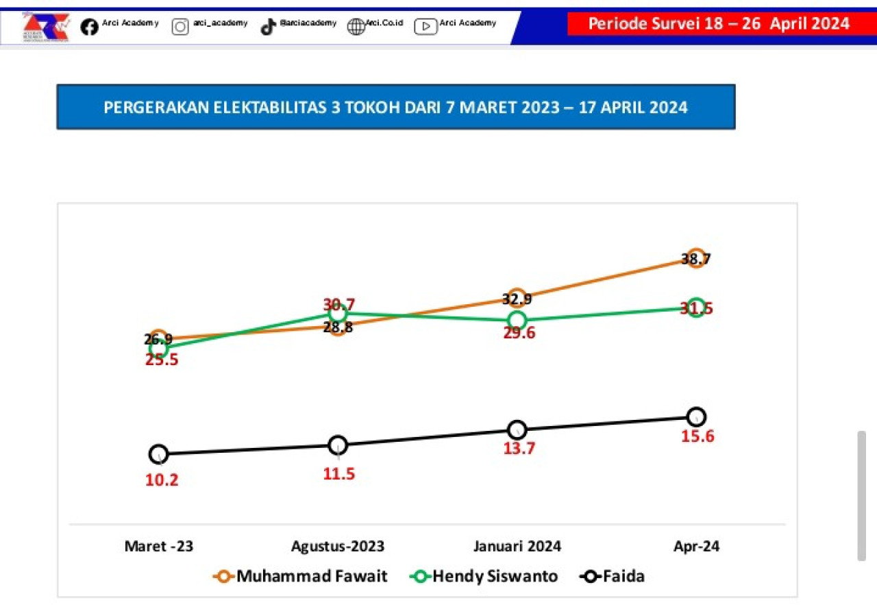 Tiga tokoh ini mengalami tren kenaikan elektabilitas bahkan pada Bulan Agustus 2023 Hendy Siswanto sempat mengungguli Muhammad Fawat.