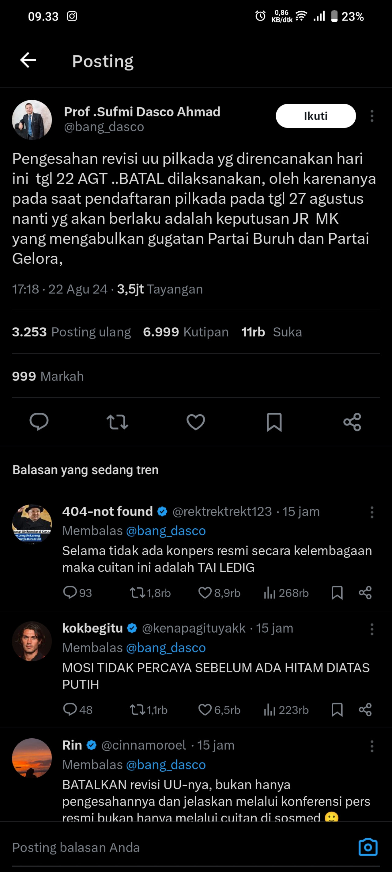 "Konferensi pers yu bang, undang temen-temen media buat dorstop dan tanya jawab pertanyaan. Kita kawal sampai BATAL," cuit @Bintang.