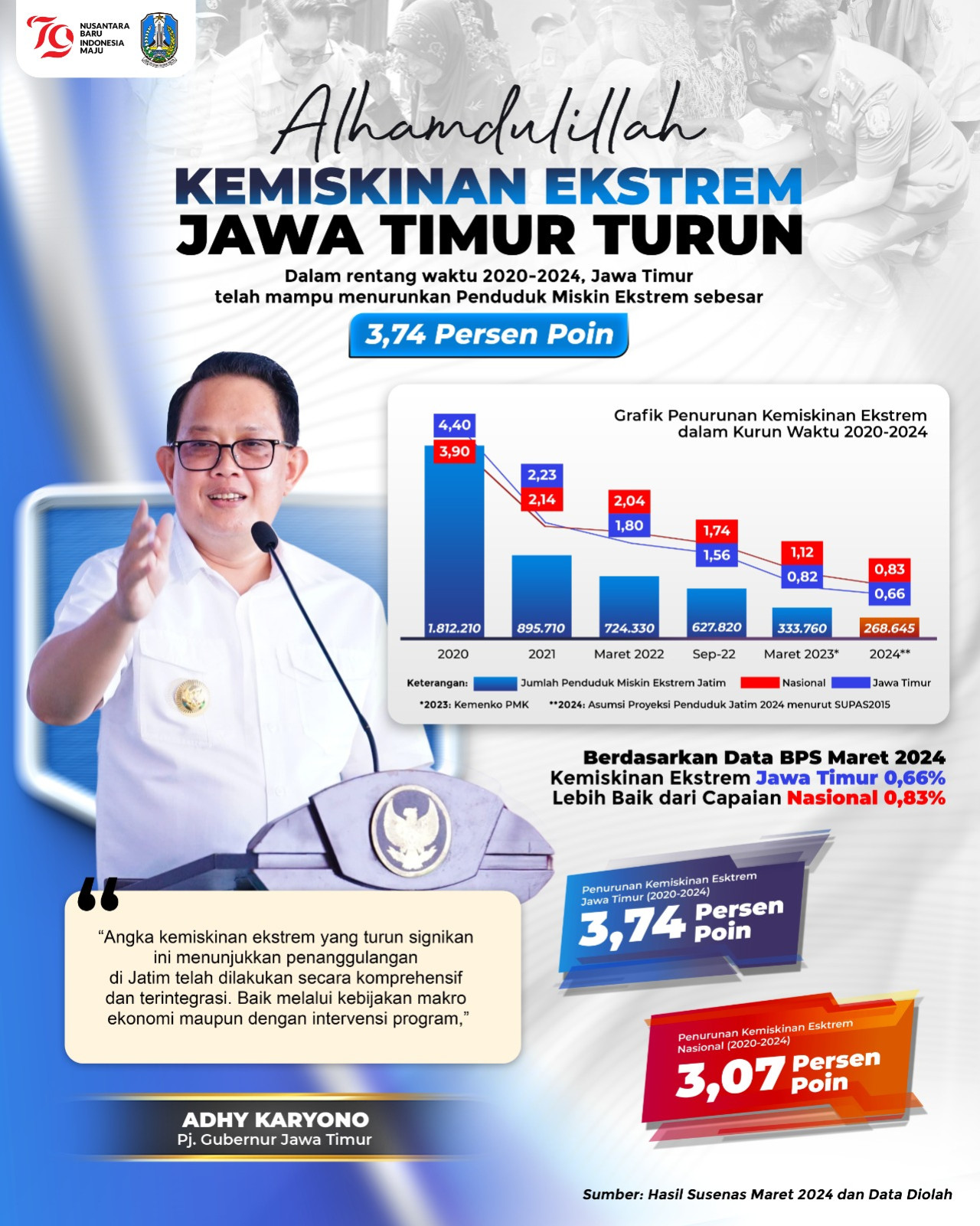 Penjabat (Pj) Gubernur Jawa Timur Adhy Karyono menegaskan, angka ini merupakan capaian membanggakan karena Jatim berhasil menurunkan angka kemiskinan ekstrem lebih baik dari penurunan nasional.