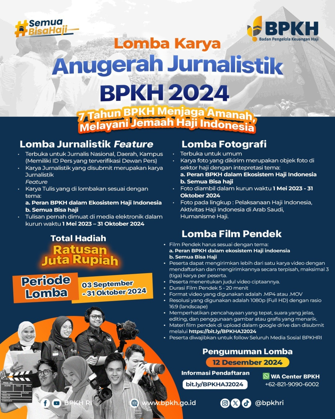 "Anugerah Jurnalistik BPKH 2024 merupakan penyelenggaraan yang pertama, dan kami berharap ini dapat berlanjut terus dalam rangka mengapresiasi tugas para teman-teman jurnalis dalam mengabarkan kabar haji terkini yang dapat bermanfaat bagi masyarakat dan umat Islam di seluruh Indonesia," ucap Zaky, dalam siaran resminya, Rabu (4/9/2024).