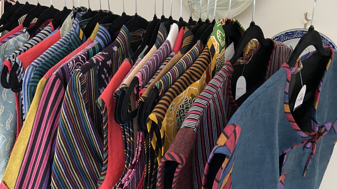 Sementara di kursi, dua tumpuk pakaian, baru saja diantar oleh penjahit. Nomor dua dari atas, terlihat kombinasi lurik dan wastra dari Badui yang tak kalah memesona. Aksen mirip ujung syal, yang menjuntai ke luar tumpukan membuat karya mereka berdua itu terlihat lebih mewah.