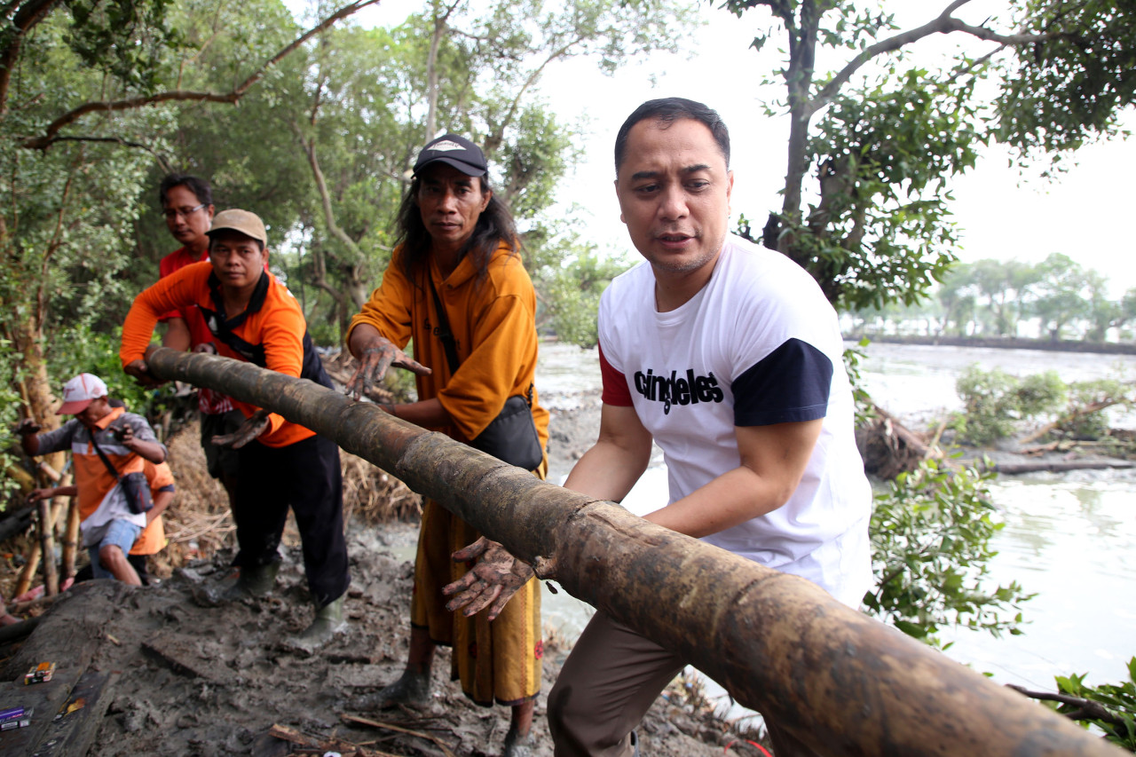 Saat di lokasi, Wali Kota Eri nampak ikut gotong royong bersama warga membuat tanggul. Ia membantu menyiapkan kayu bambu hingga karung untuk menambal tanggul yang jebol akibat rob.