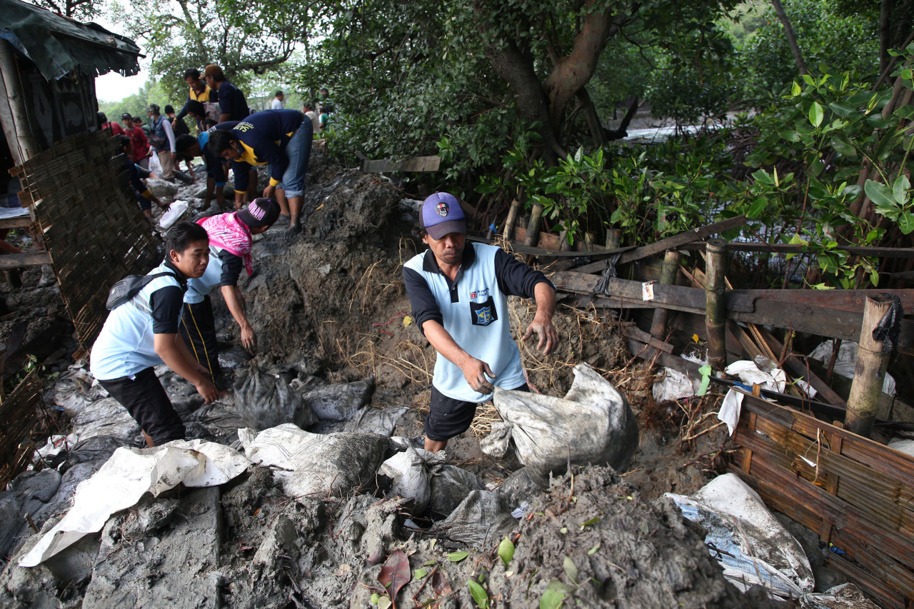 Upaya mitigasi kali ini dengan cara meninggikan tanggul menggunakan sandbag dan bambu di sekitar tambak dan rumah warga.
