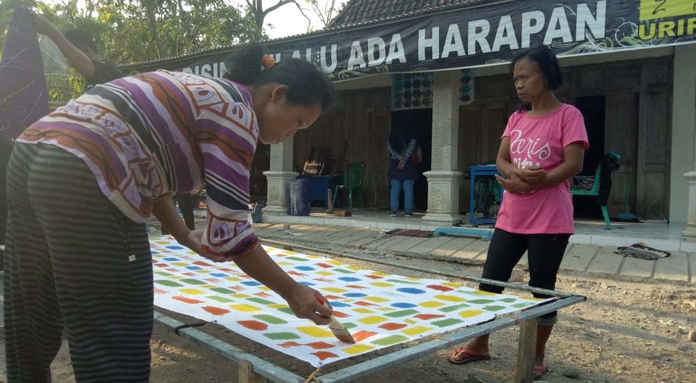 Tepat di depan Rumah Harapan, sudah tersedia selembar kain polos. Terlihat, seorang wanita sibuk menciprat-cipratkan (memercik-mercikkan) cat atau pewarna kain menggunakan kuas.