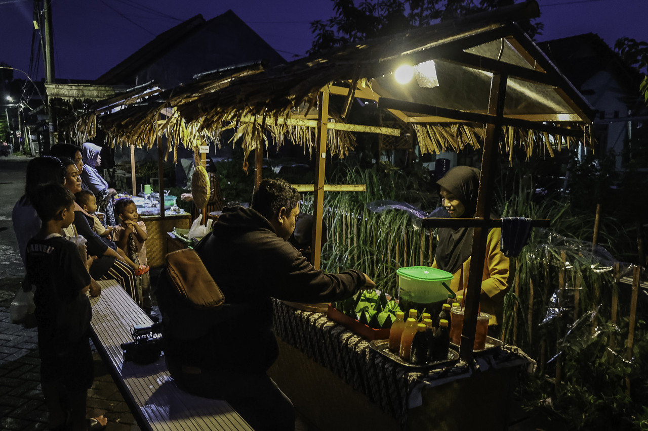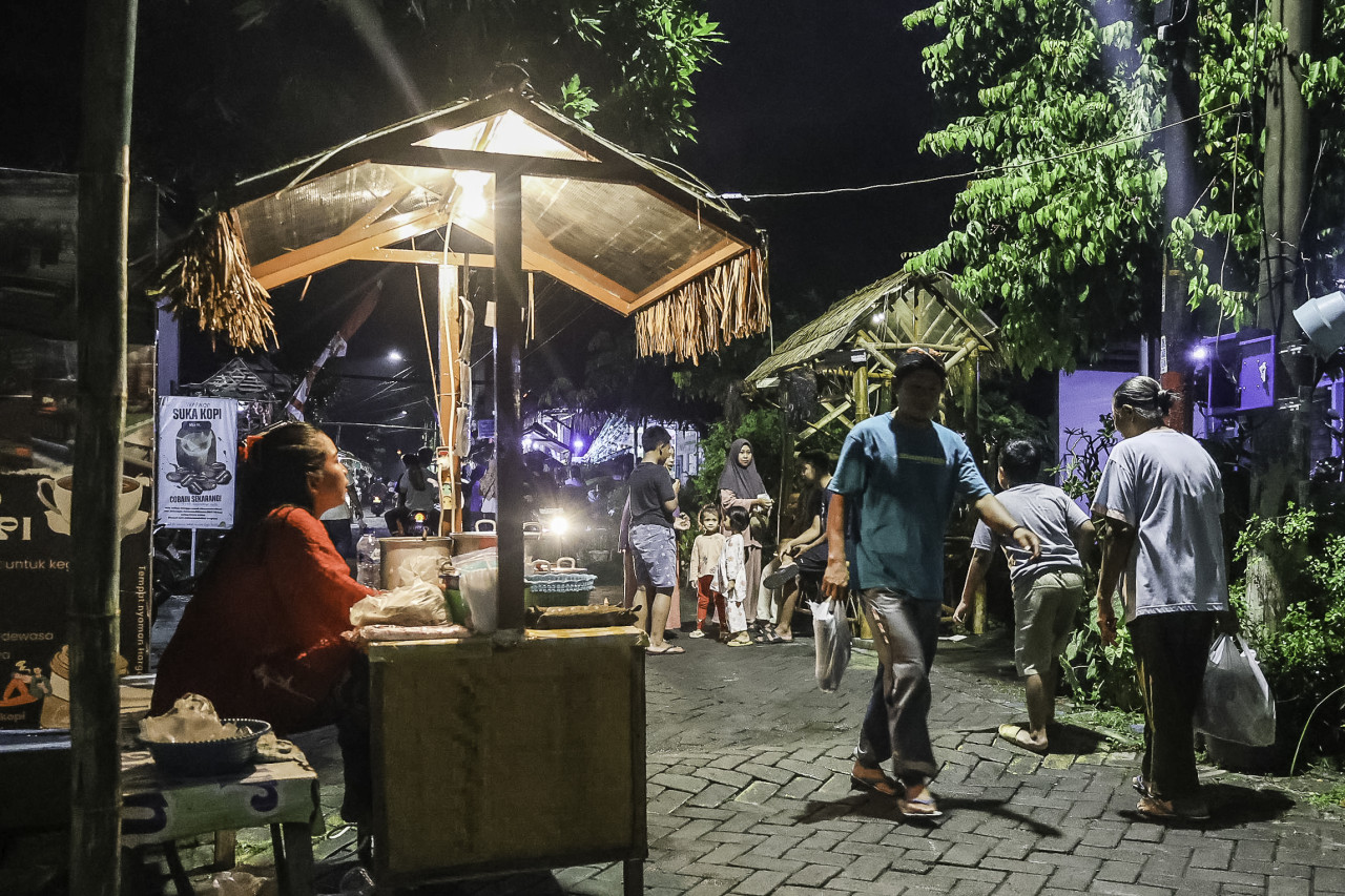 Memasuki kampung dengan panjang sekitar 400 meter itu, mata akan disuguhkan dengan beberapa saung dari sesek dan bambu tempat para UMKM menyajikan kuliner mulai dari wedang, ketan, hingga makanan berat yang dapat dinikmati sembari berkeliling.