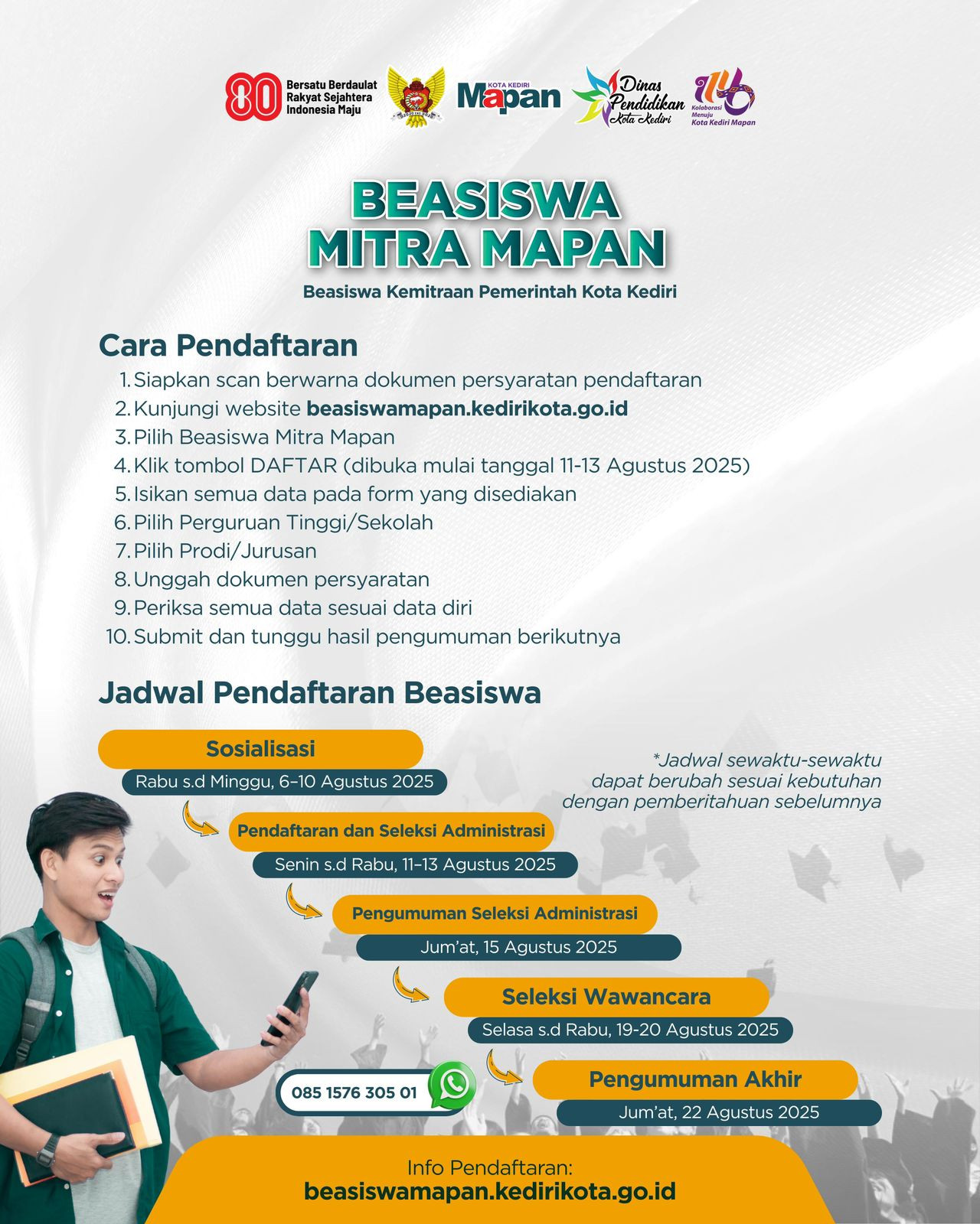 Wiyata Rabu, 06 Agu 2025 19:00 WIBjatimnow.com - Pemerintah Kota Kediri kembali membuka pintu kesempatan bagi warganya untuk meraih pendidikan berkualitas melalui program Beasiswa Mitra MAPAN. Ada lebih dari 300 kuota beasiswa, mulai dari jurusan ilmu hukum hingga kedokteran gigi. Di antaranya 100 untuk Sekolah Menengah Kejuruan (SMK).
