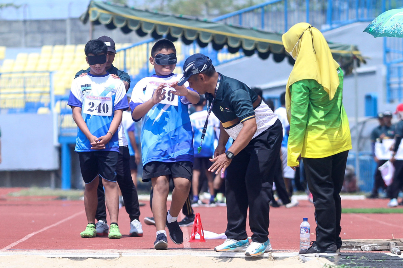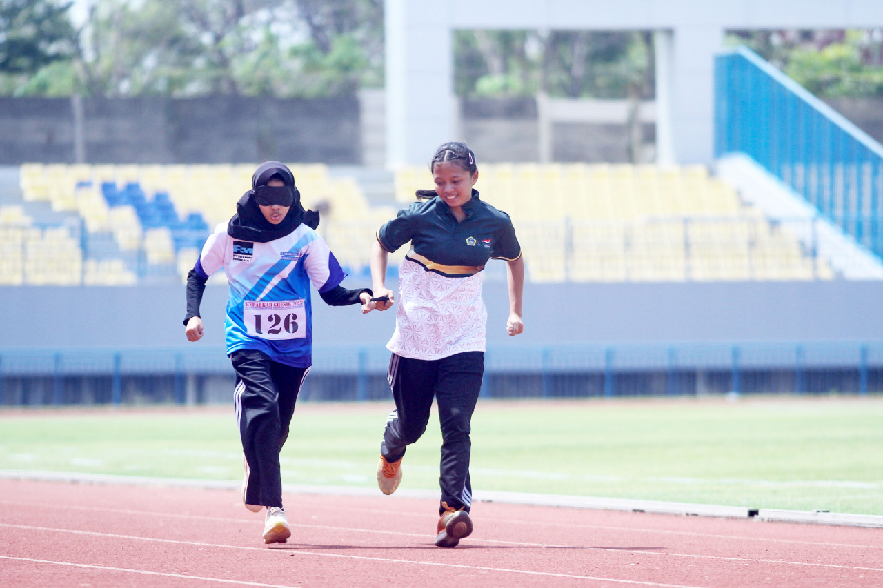 FOTO: Seorang atlet disabilitas dengan dibantu pemandu sedang mengikuti lomba lari di Kejuaraan Paralimpiade Kabupaten Gresik (KEPARKAB) 2025.